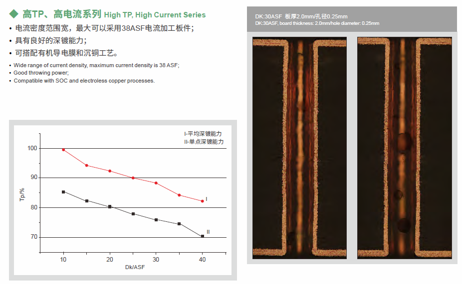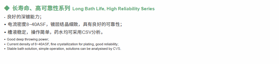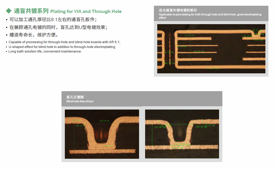 VCP series refers to the acid copper plating system developed for VCP equipment, and applies to plating demands for various boards, applies to plating for through hole with high current density and PTH , organic conducting film and other direct plating, VCP can be used for both through hole and blind hole plating.