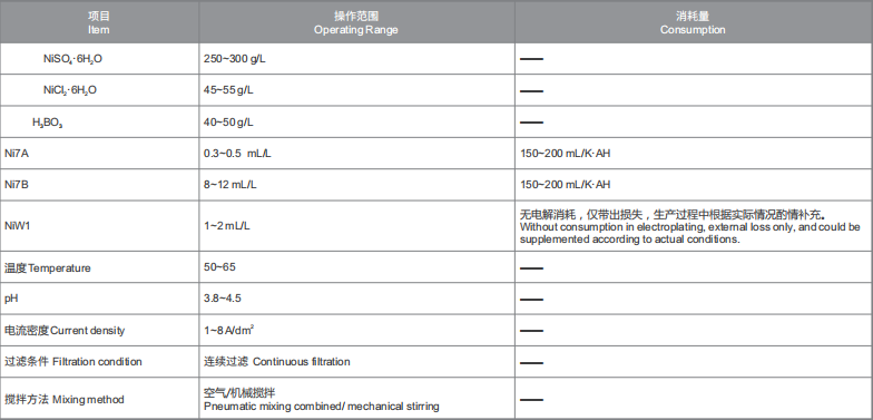 Ni7A:俗稱光亮劑,負(fù)責(zé)出光和填平。Ni7A不足時(shí),鍍液出光慢,填平能力不足;Ni7A過量時(shí),低電流密度區(qū)發(fā)暗,嚴(yán)重過量時(shí),鍍層脆性大,甚至造成漏鍍;